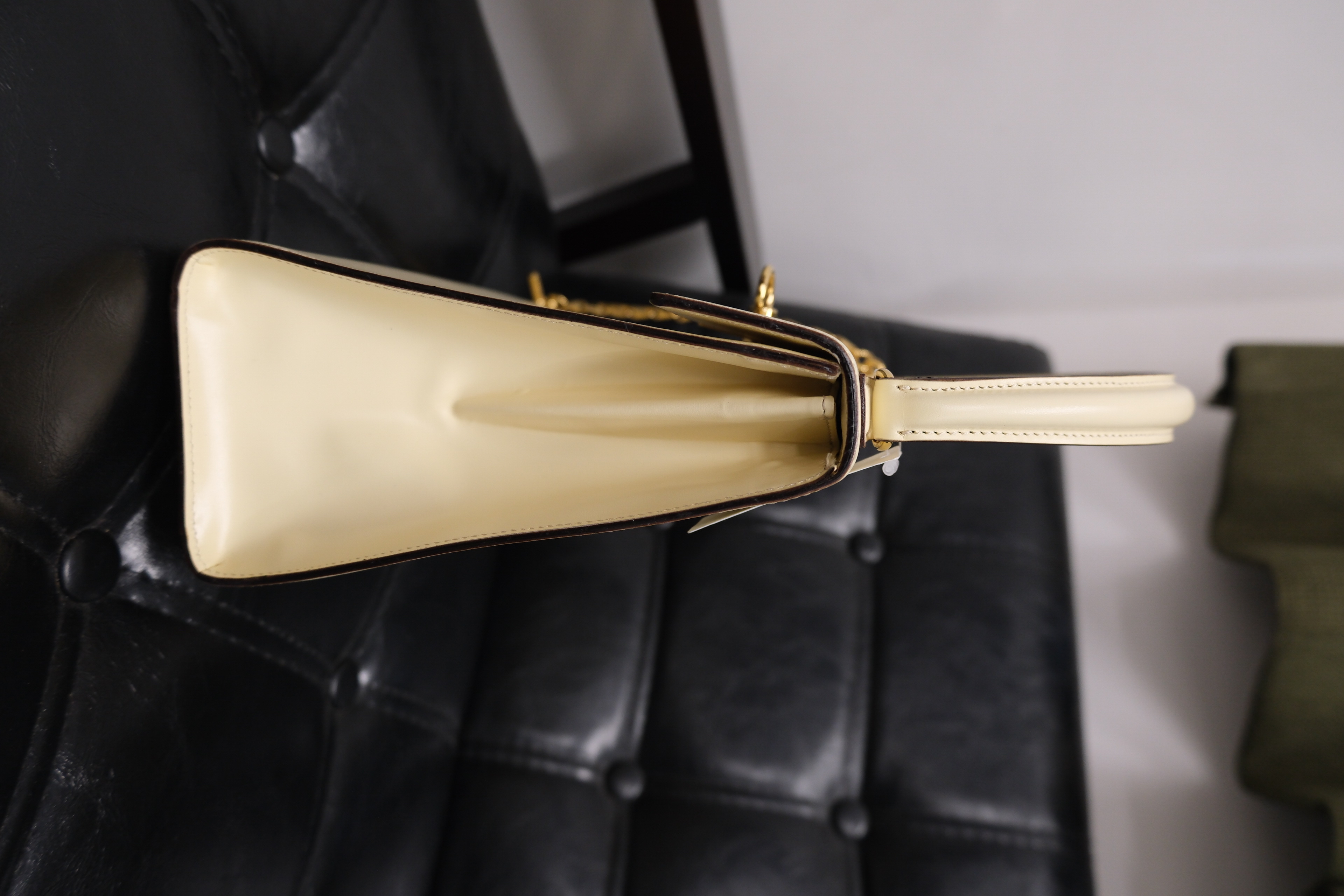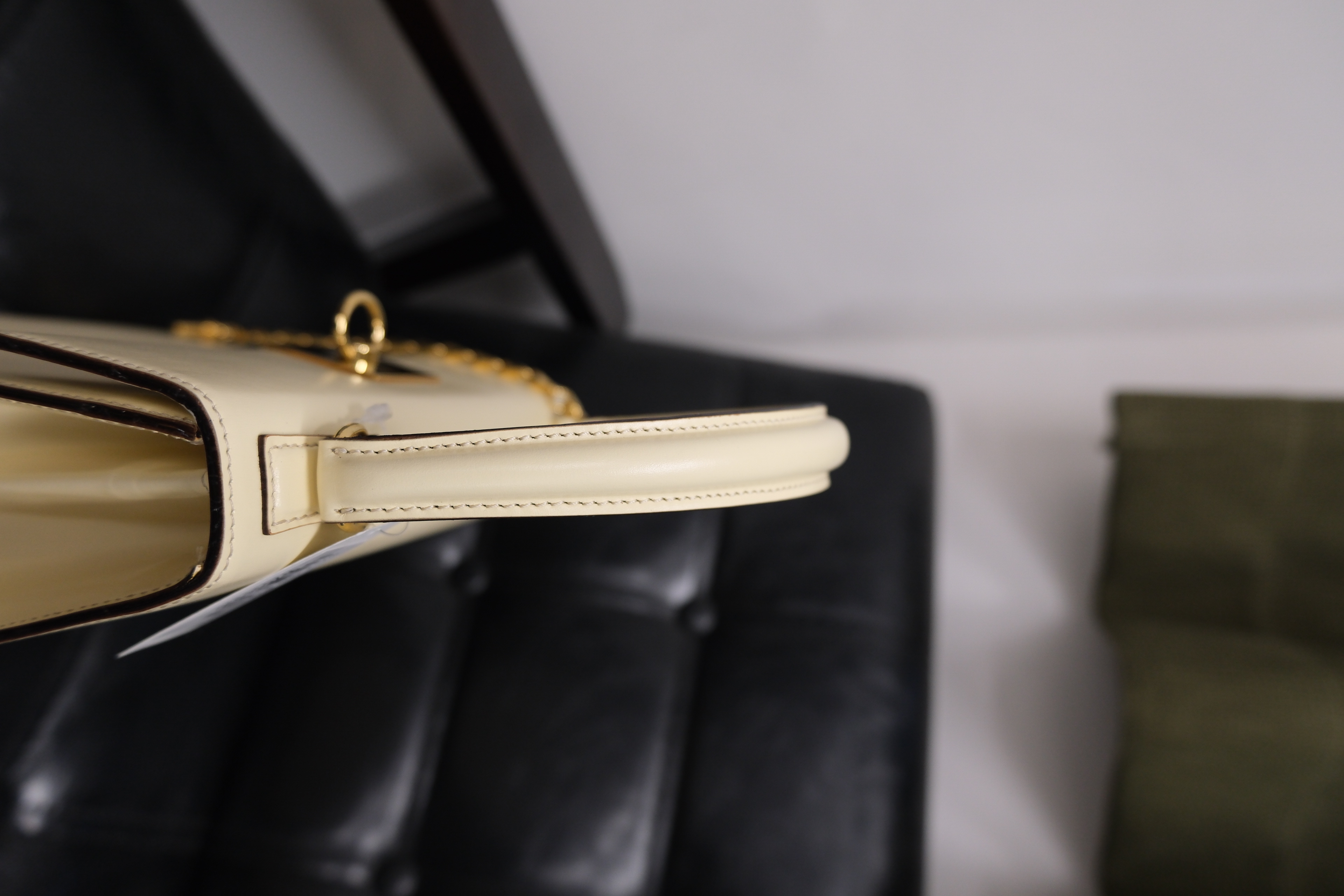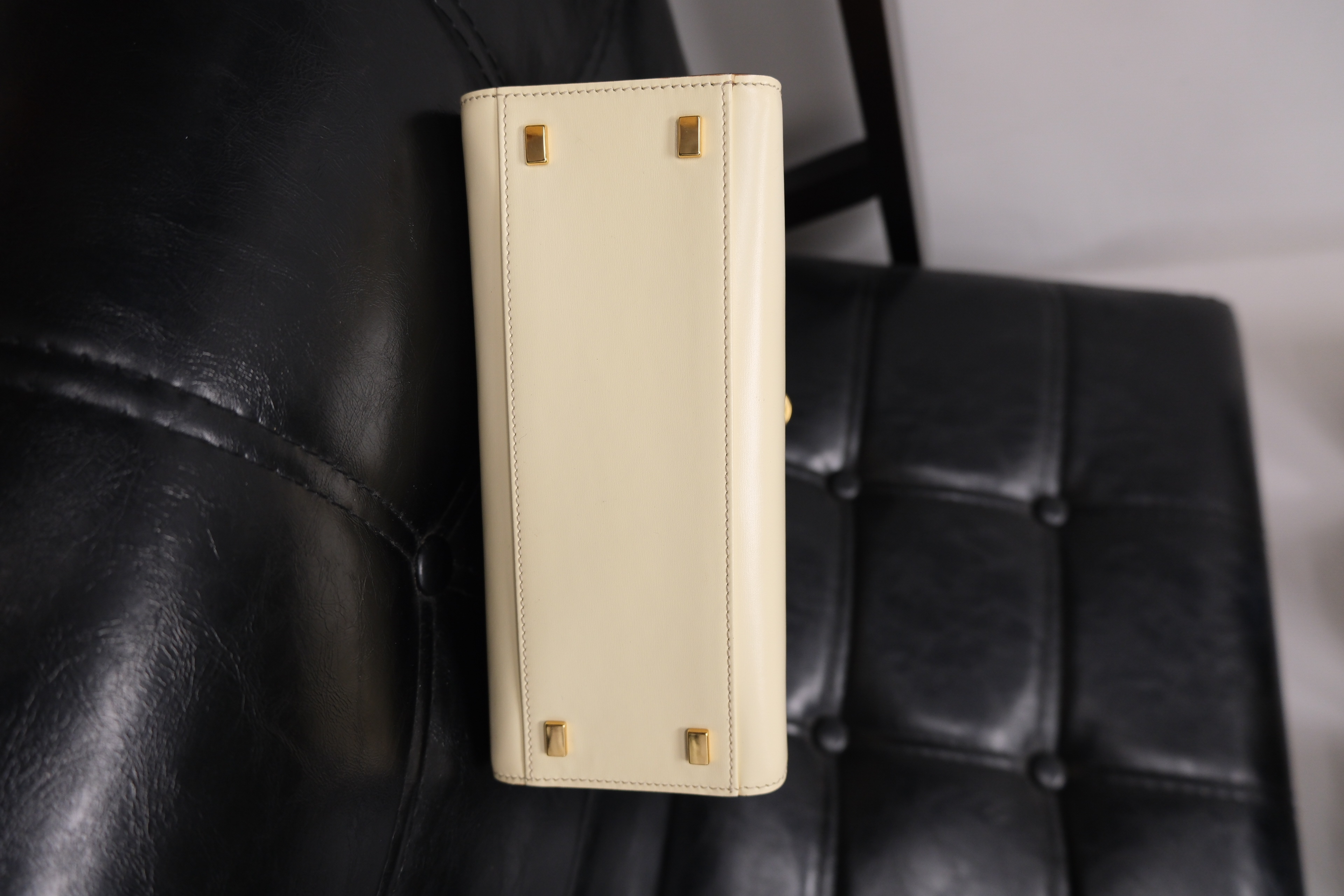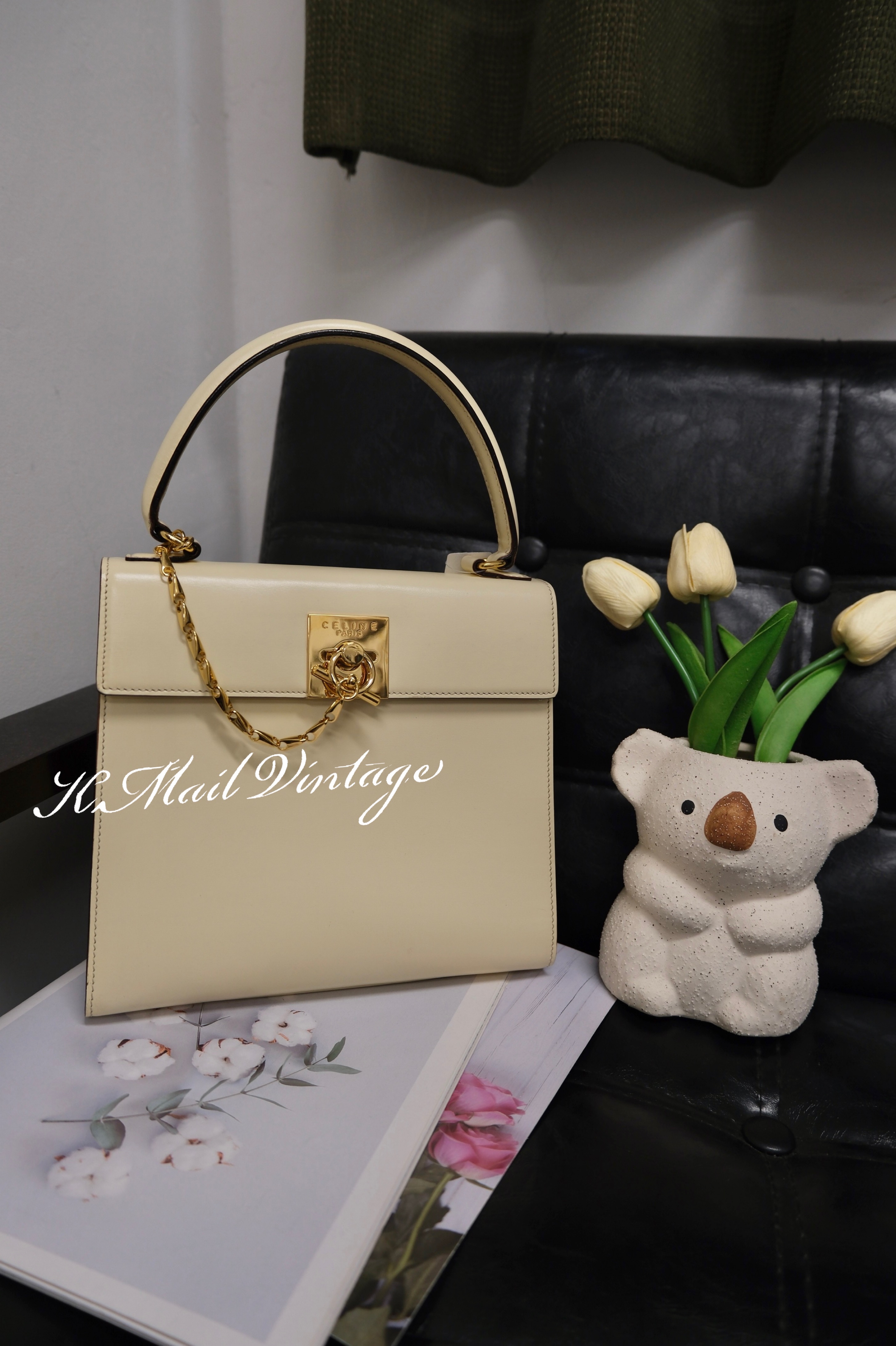 Celine中古Kelly包~ 奶油白Box皮+金色魚骨鏈,優雅復古氛圍感拉滿 手提or肩背都🈴通勤日常都能輕鬆駕奴 稀有中古款,收藏價值高,實用又經典,氣質女孩必入 搭配簡約穿搭,輕鬆get高級感 送金屬鏈條,可單肩/斜背 配件:卡仔 Rank A 整體不錯 有正常使用保存痕跡‼️ 整包內外五金已清潔🧹 Size:W23.5 x H20 x D10 cm 中古品均有歲月痕跡,完美主義者請慎重考慮‼️ Photo by @k.mail_vintage2 All Brand designs,logo & copyright belong to Celine