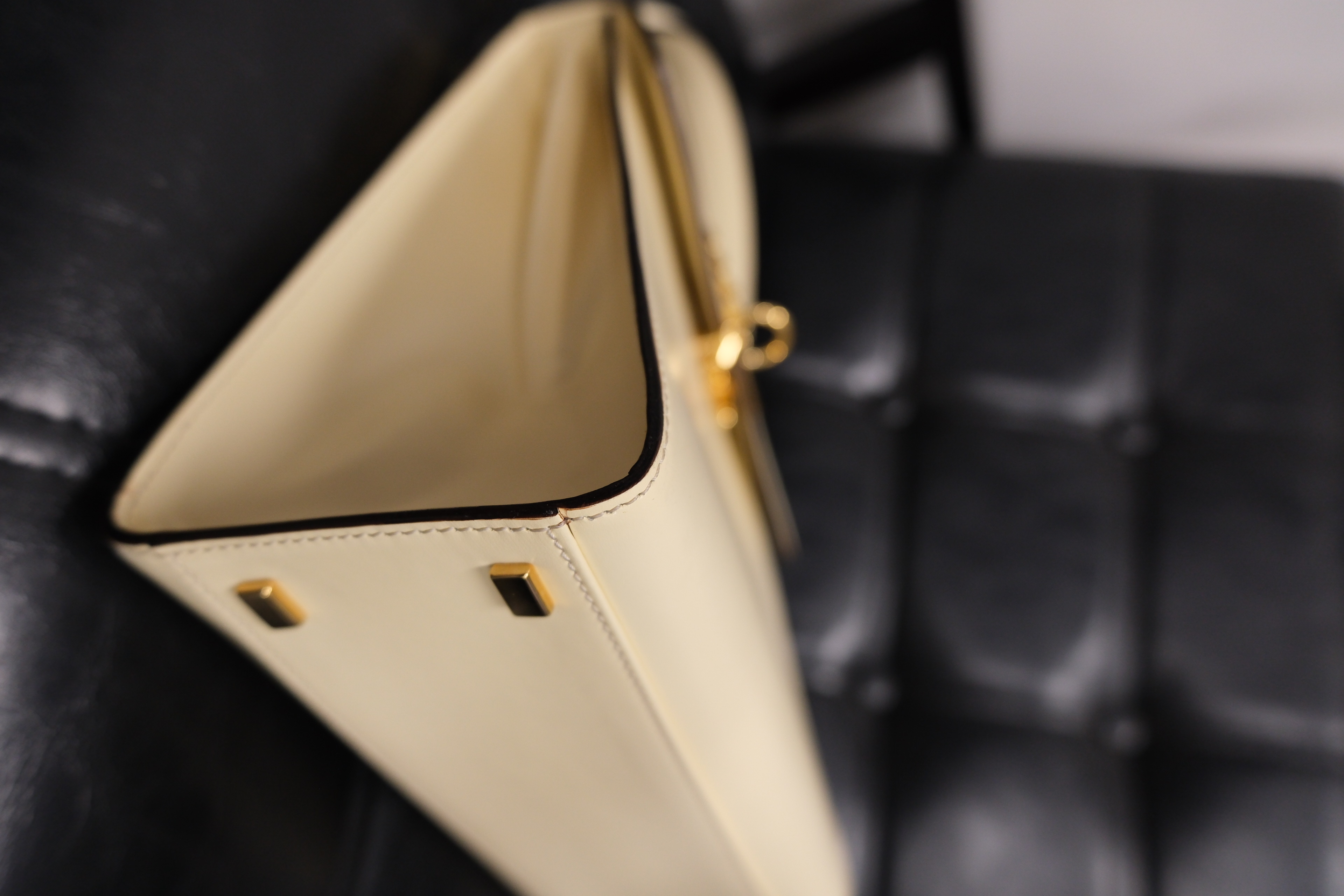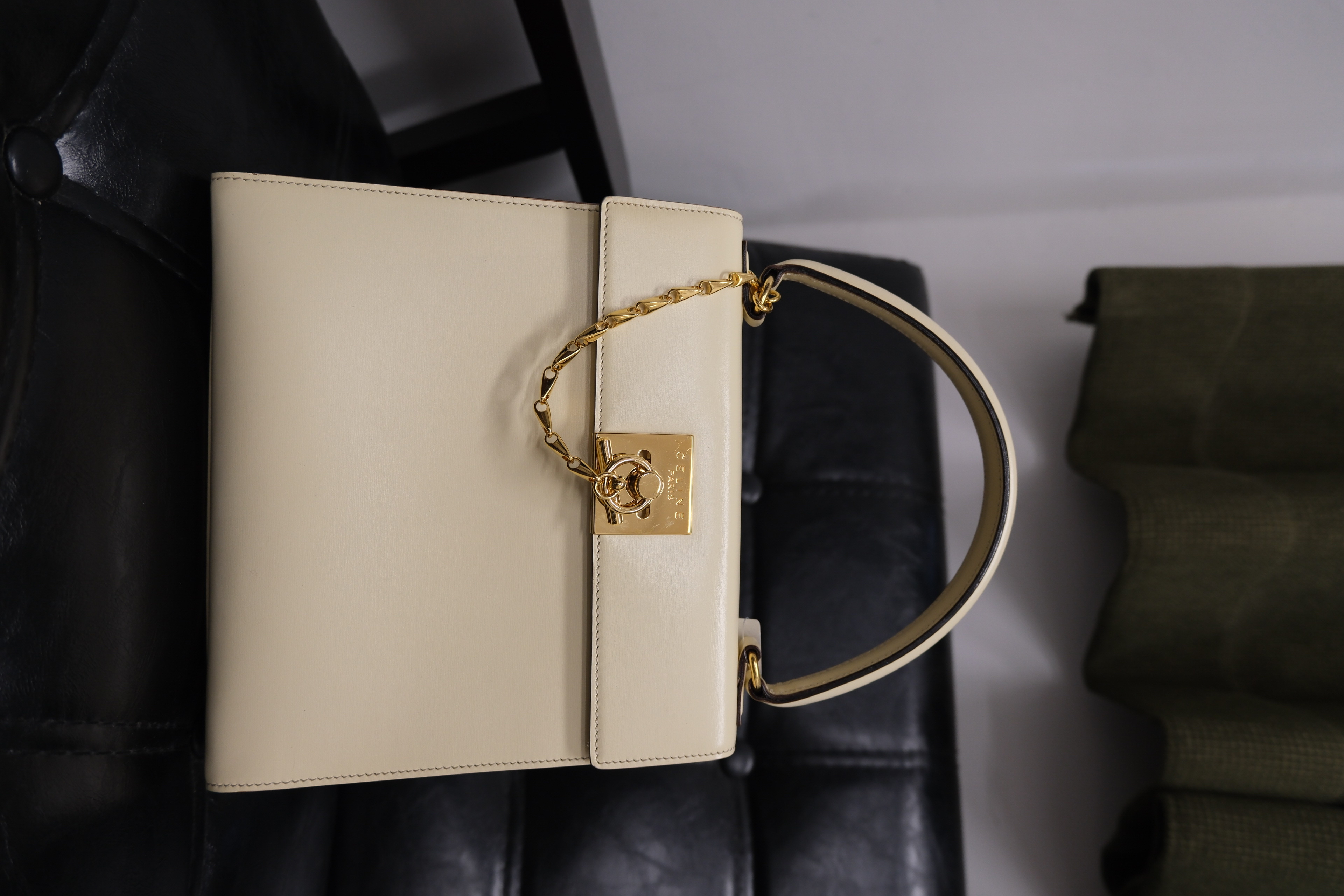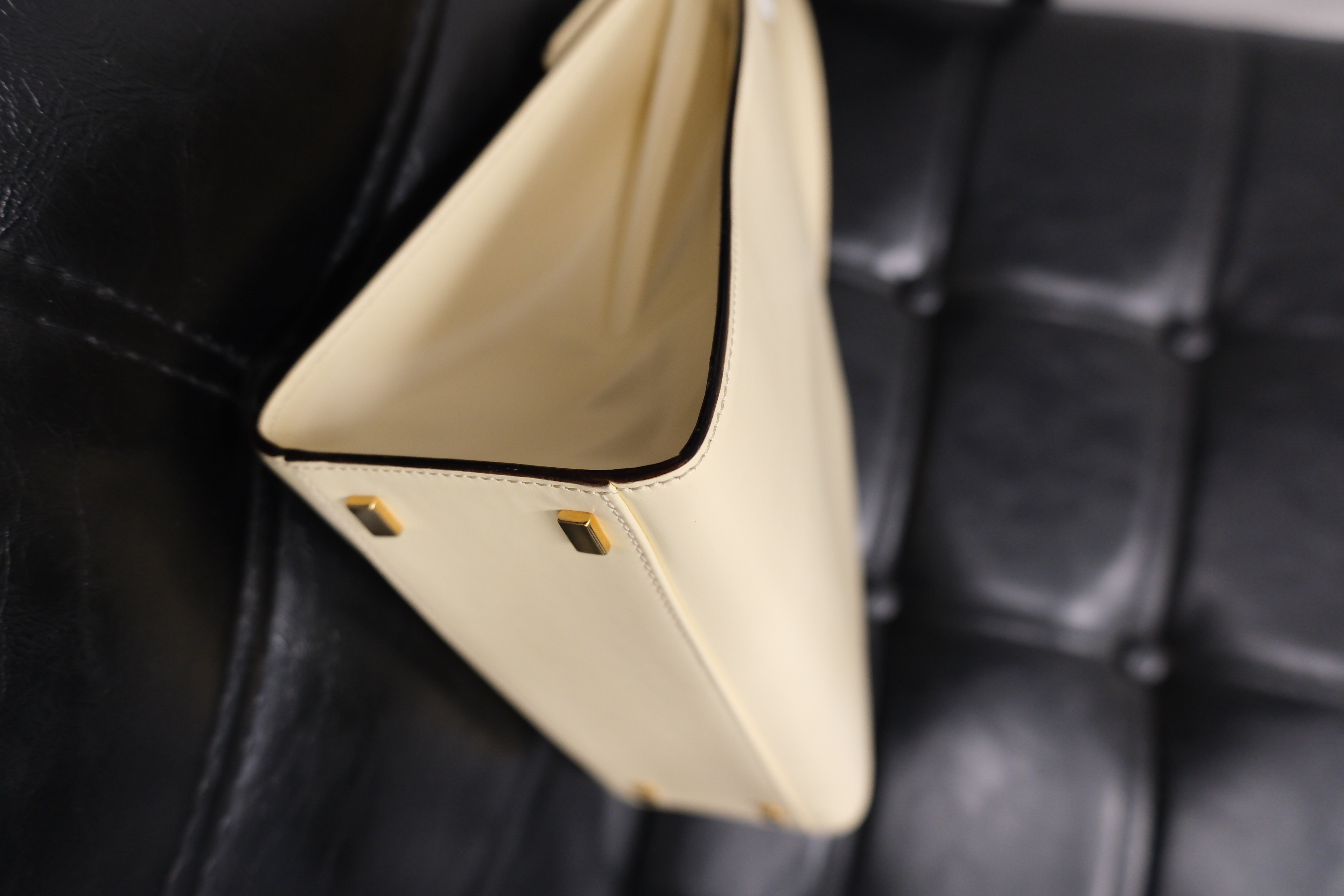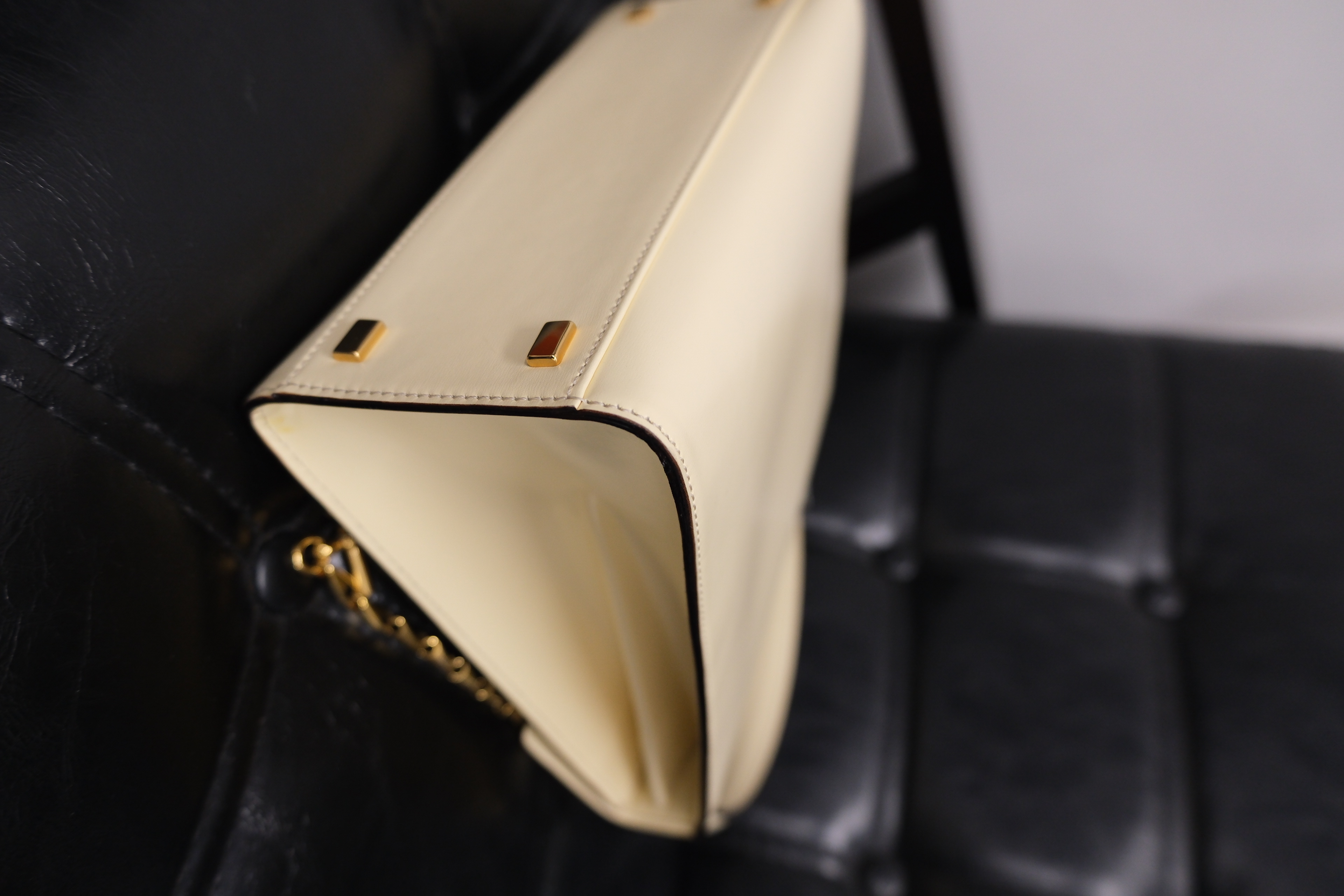 Celine中古Kelly包~ 奶油白Box皮+金色魚骨鏈,優雅復古氛圍感拉滿 手提or肩背都🈴通勤日常都能輕鬆駕奴 稀有中古款,收藏價值高,實用又經典,氣質女孩必入 搭配簡約穿搭,輕鬆get高級感 送金屬鏈條,可單肩/斜背 配件:卡仔 Rank A 整體不錯 有正常使用保存痕跡‼️ 整包內外五金已清潔🧹 Size:W23.5 x H20 x D10 cm 中古品均有歲月痕跡,完美主義者請慎重考慮‼️ Photo by @k.mail_vintage2 All Brand designs,logo & copyright belong to Celine