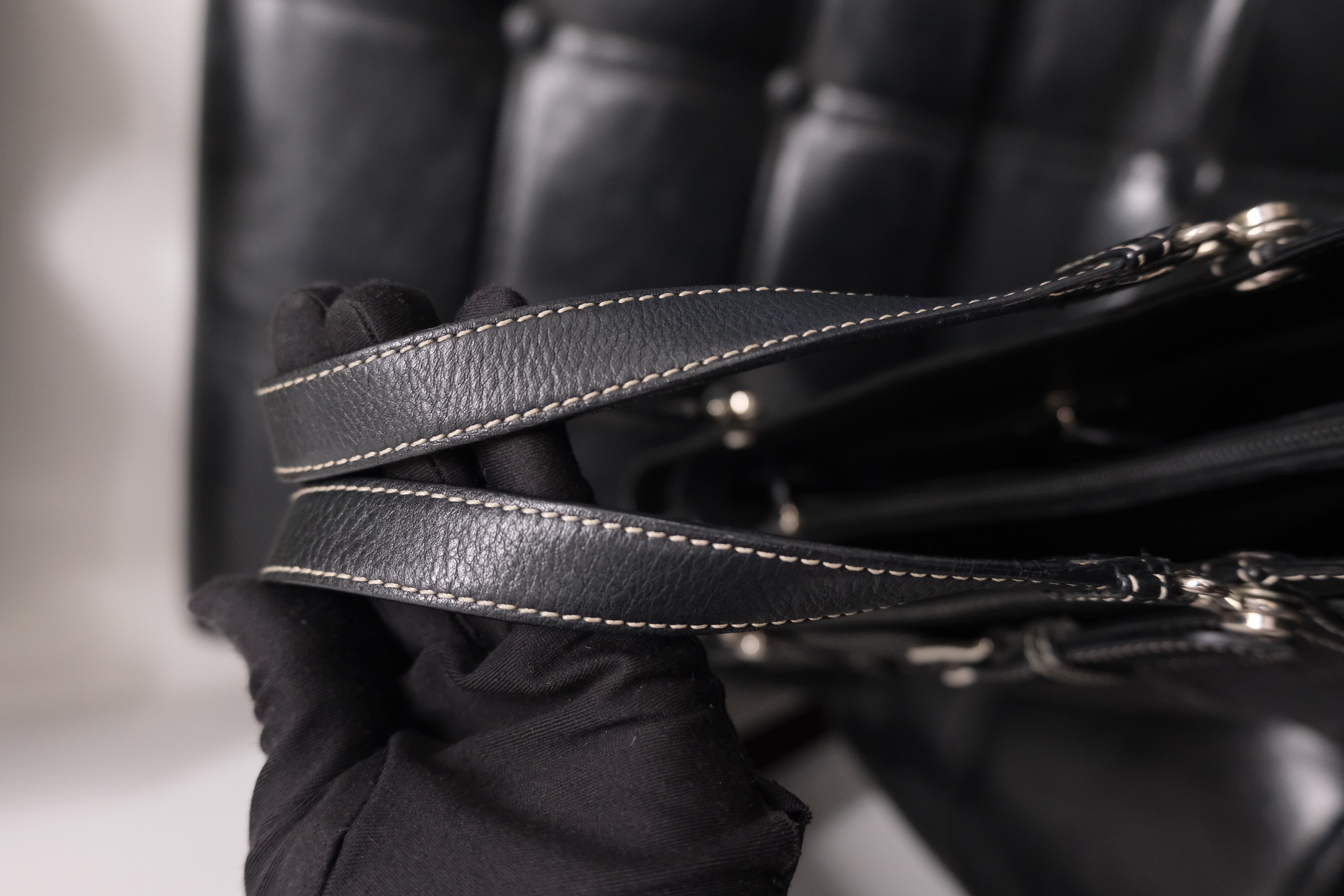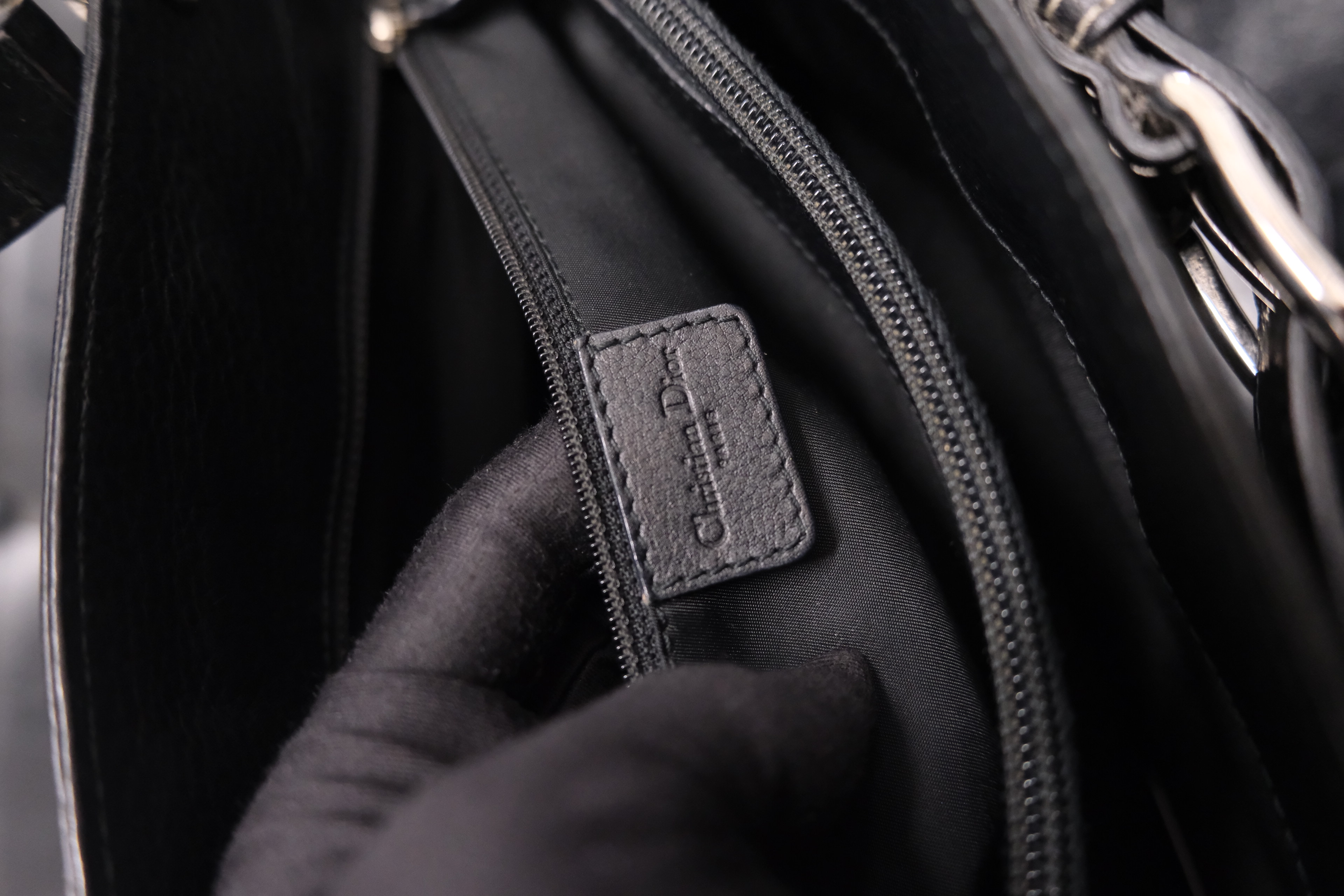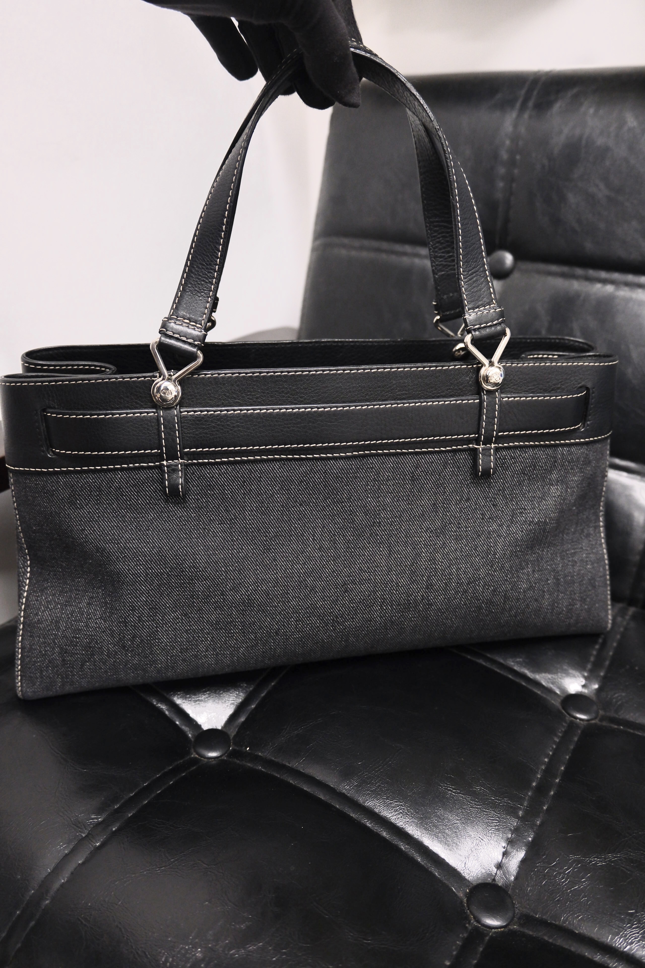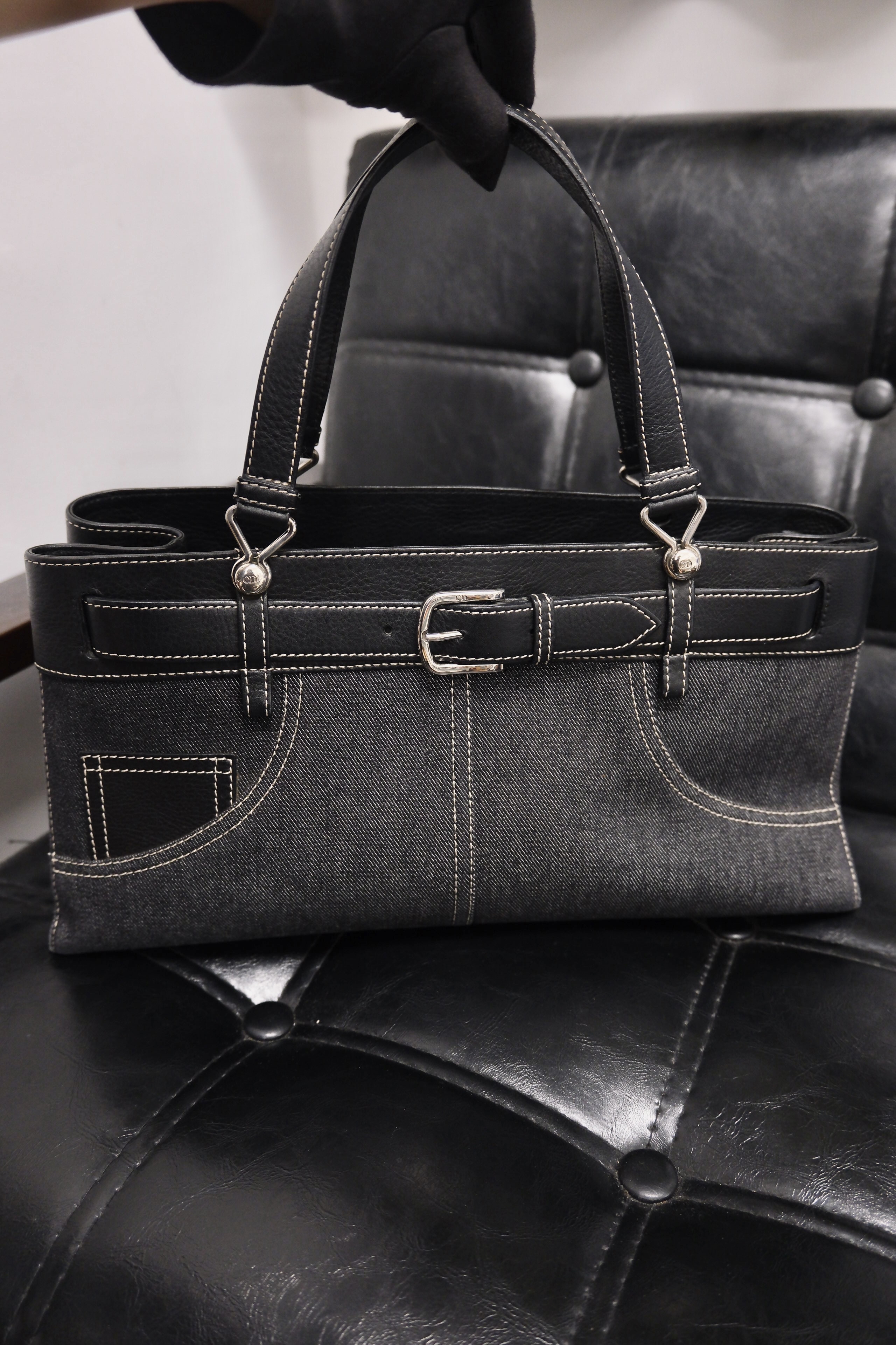 Dior牛仔拼皮手提包 黑色丹寧牛仔布+皮革拼接 白色外縫線超有工裝感 包型長方,通勤休閒都能用 五金復古,手柄皮革耐用 內部空間寬敞,日常物品輕鬆裝下 中古市場稀有品,實用又有收藏價值 Rank A 整體不錯,有正常使用保存痕跡‼️ 整包內外五金已清潔🧹 Size:W38 x H18x D11 cm 中古品均有歲月痕跡,完美主義者請慎重考慮‼️ Photo by @k.mail_vintage2 All Brand designs,logo & copyright belong to Dior