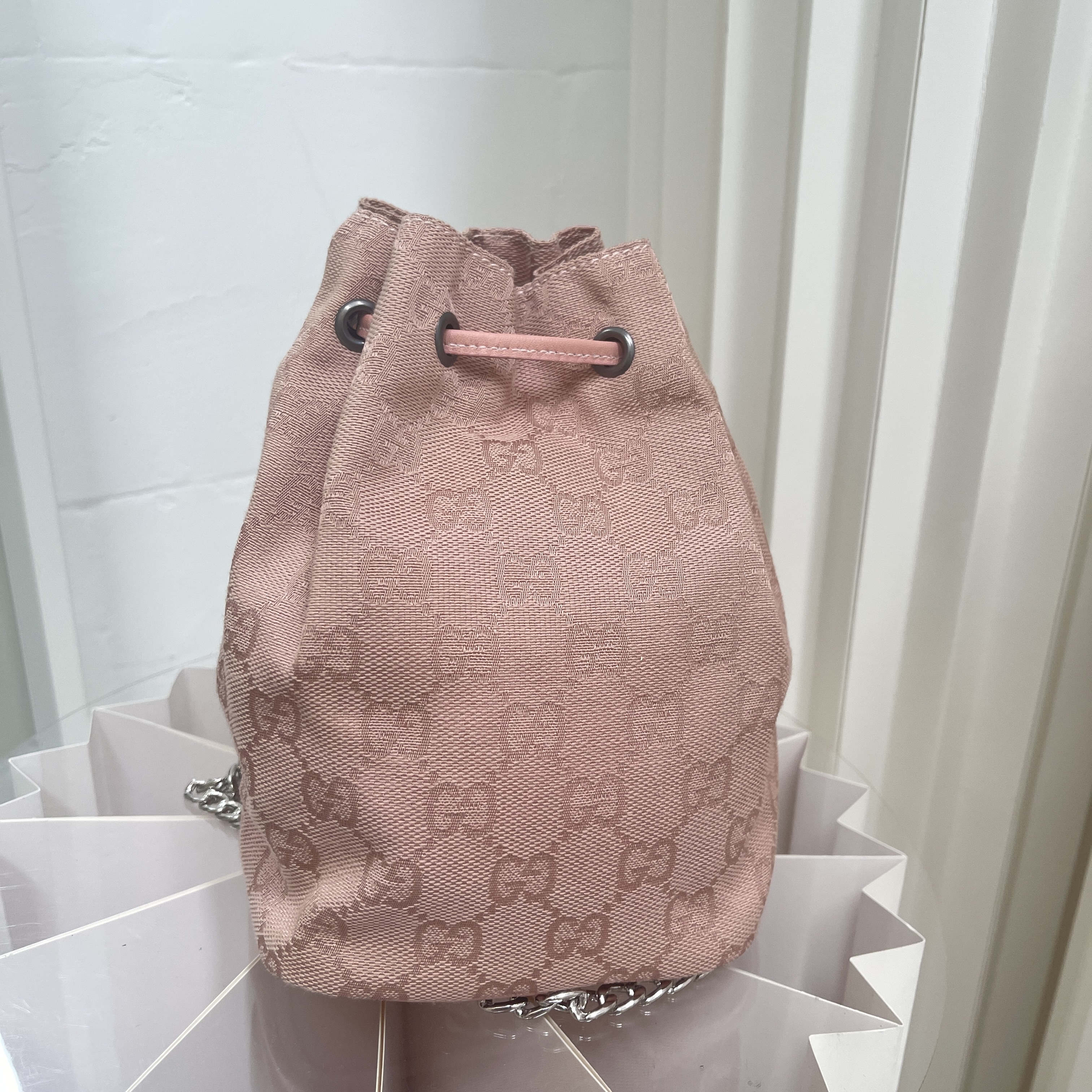 清新的粉色🌱 粉色調柔美動人😚 陽光下,淡雅的粉色如同綻放的櫻花,恰到好處的甜美✨ 踏入春季,櫻花粉水桶包為你帶來溫暖和活力✅ 經典的雙 G 花紋,彰顯高貴品味🌸 精緻的抽繩束口設計,拿取東西方便✔️ 內部容量,能裝下所有日常用品,配上金屬鏈條,便於出行攜帶⛓ 輕輕一輓,這顆櫻花粉水桶包,即點亮你整身裝束💖 喜歡粉色系的你不仿可以考慮一下它💓 Size:W12 x H18 x D12 cm 中古品均有歲月痕跡,完美主義者請慎重考慮‼️ Photo by @k.mail_vintage2 All Brand designs,logo & copyright belong to Gucci